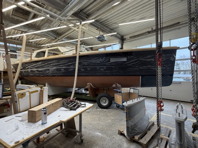 Die ersten Bilder vom fertig lackierten Rumpf sind ein Highlight.Unter der Schutzfolie schimmert bereits das dunkle Blau – kombiniert mit dem weißen Deckshaus ergibt das den unverwechselbaren Sirius-Charakter.